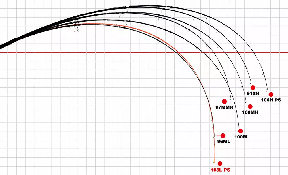 These are comparison images of BlueSniper Shore Casting Series which are loaded 1kg weight on tip. 97MMH have got sensitivity and flexibility with same butt power as 100MH. These two models 910H and 106H have been designed to load almost same power on butt section. 910H is for metal jig mainly, 106H is for plug specially diving pencil bait mainly.